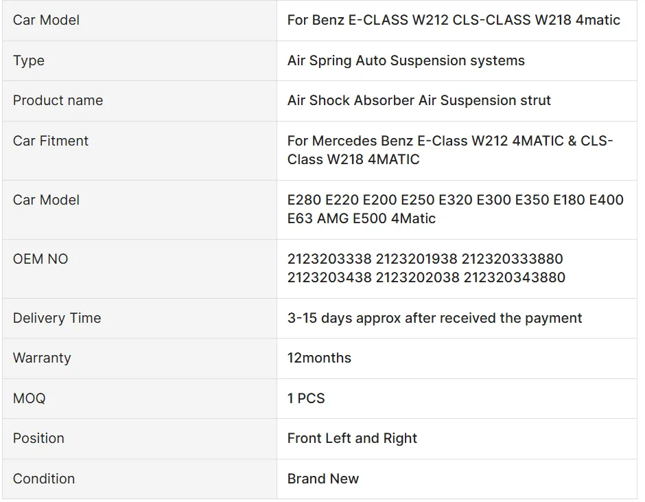 Upgrade your Mercedes Benz E-Class W212 or CLS-Class W218 with our premium 4Matic Front Air Suspension Shock Absorber. Enhance ride comfort and vehicle stability. Compatible with part numbers 2123203438 and 2123203338.