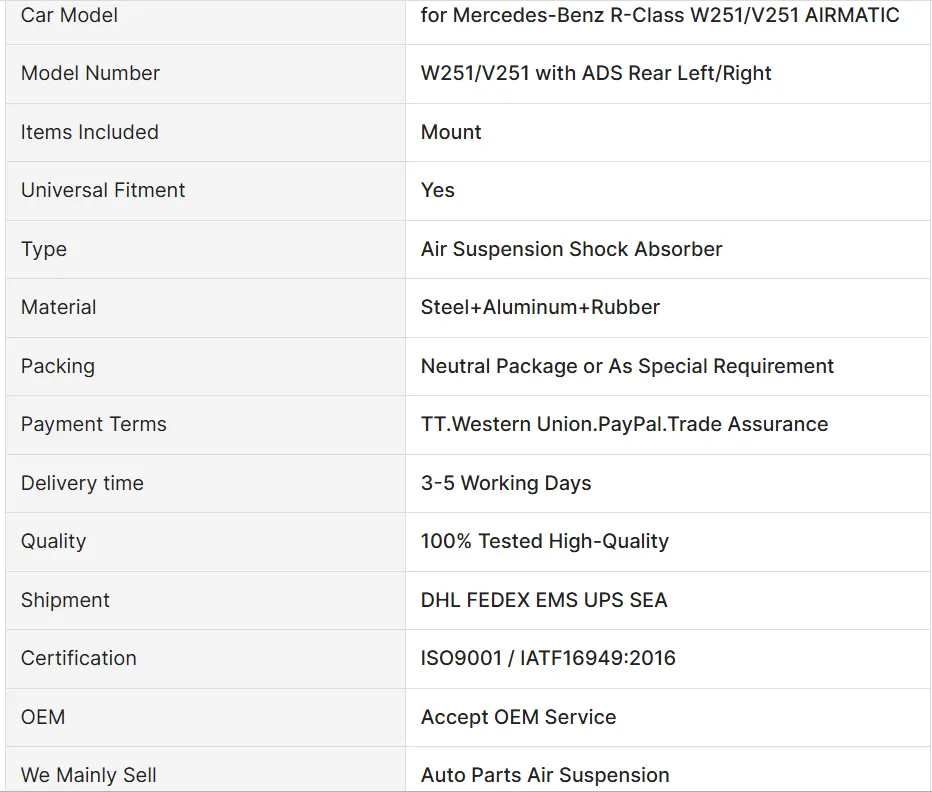 Upgrade your Mercedes Benz R-Class W251/V251 with high-quality Air Suspension Rear Shock with ADS. Compatible with part numbers 2513201931 and 2513201031. Enhance ride comfort and stability.