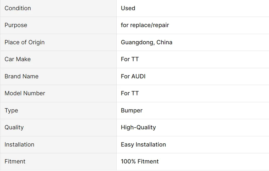 Upgrade your AUDI TT with our 2024 front bumper assembly. Enhance aesthetics and protection with this premium body kit part, designed for seamless fit and superior durability. Perfect for car enthusiasts seeking style and performance.