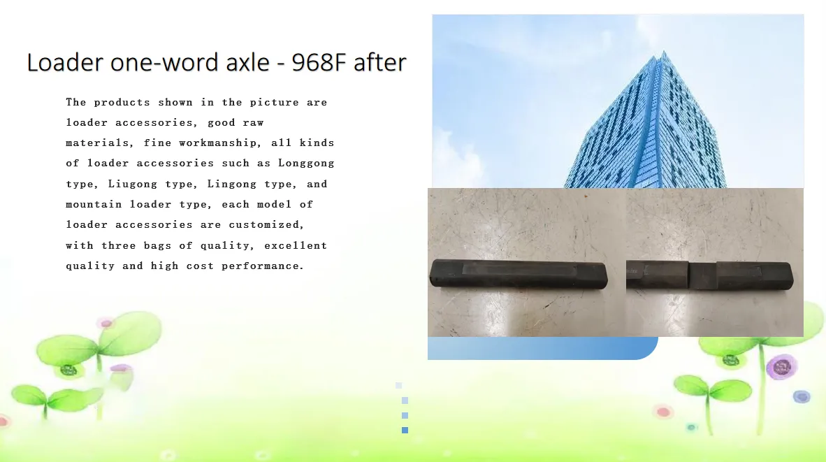 - 主要 有:加力泵 变速箱 变矩器 桥 总成 空滤 机滤 油品 刀板 斗齿 电器件 轮胎 铲斗 销套 液压件 刹车钳 转向系统等