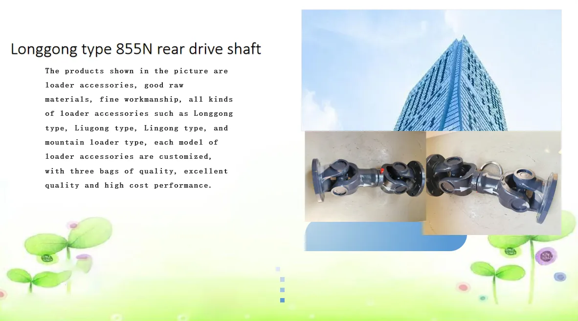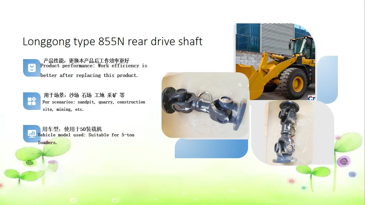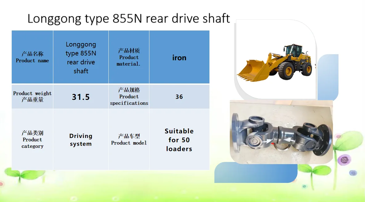The Longgong type 855N rear drive shaft is a reliable and durable component designed for optimal performance and efficiency in your drive system, ensuring smooth and powerful rear-wheel operation.
