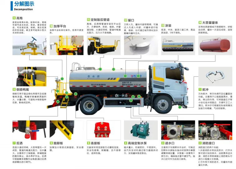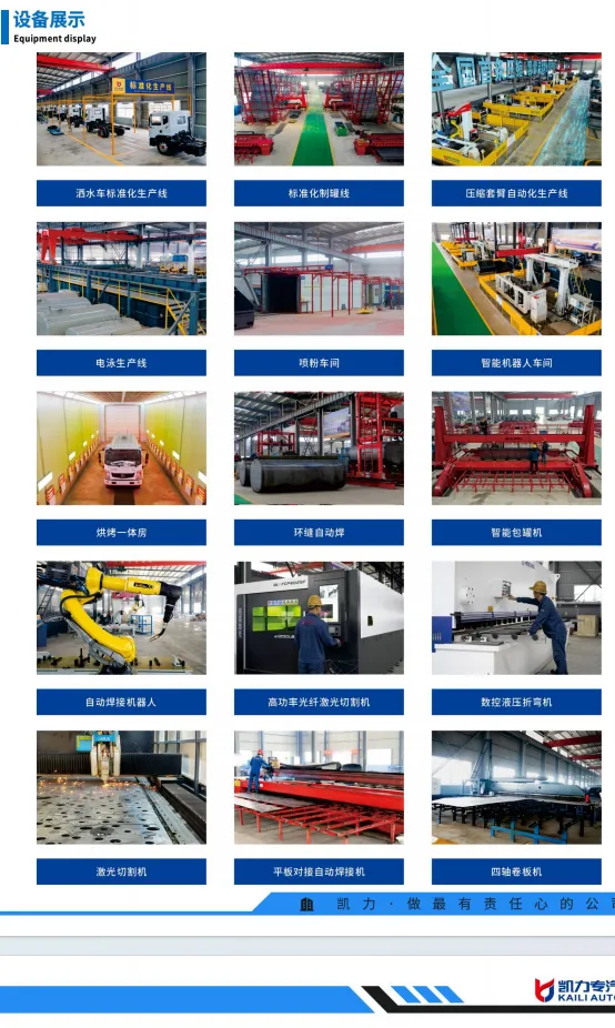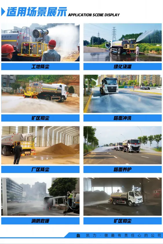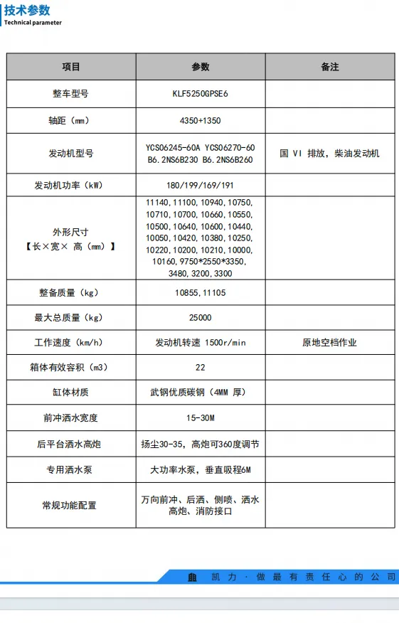 | Main Products | 凯力风洒水车又称为喷洒车、多功能洒水车、园林绿化洒水车、水罐运水车。它是由湖北凯力专用汽车有限公司在消化、吸收国内外先进技术的 ... 基础上,历经7年升级换代,自主研发设计的第4代环卫装备,产品性能达到世界领先水平,年产销规模超10000 台。 产品标配前冲、后洒、侧喷、后置式工作平台、平台上有高压水炮(可360°旋转,水雾形状可调成直冲状、大雨、中雨、 小雨、毛毛雨;调成直冲状最大射程≧ 35米,也可调成雾状最大射程≧15米)、配备优质大功率专用洒水泵,品牌取力器、杂物过滤网、国标通用65型消防接口(可通过消防栓加水)、1套自流球阀系统(可自吸自排,最大吸程7米)、2根引水钢丝胶管。适用于各种路面清洗;树木、绿化带、草坪绿化;道路、厂矿企业施工建设、高空建筑冲洗。具有洒水、压尘、高(低)位喷洒、农药喷洒、护栏冲洗、应急消防等多种功能。 | ||